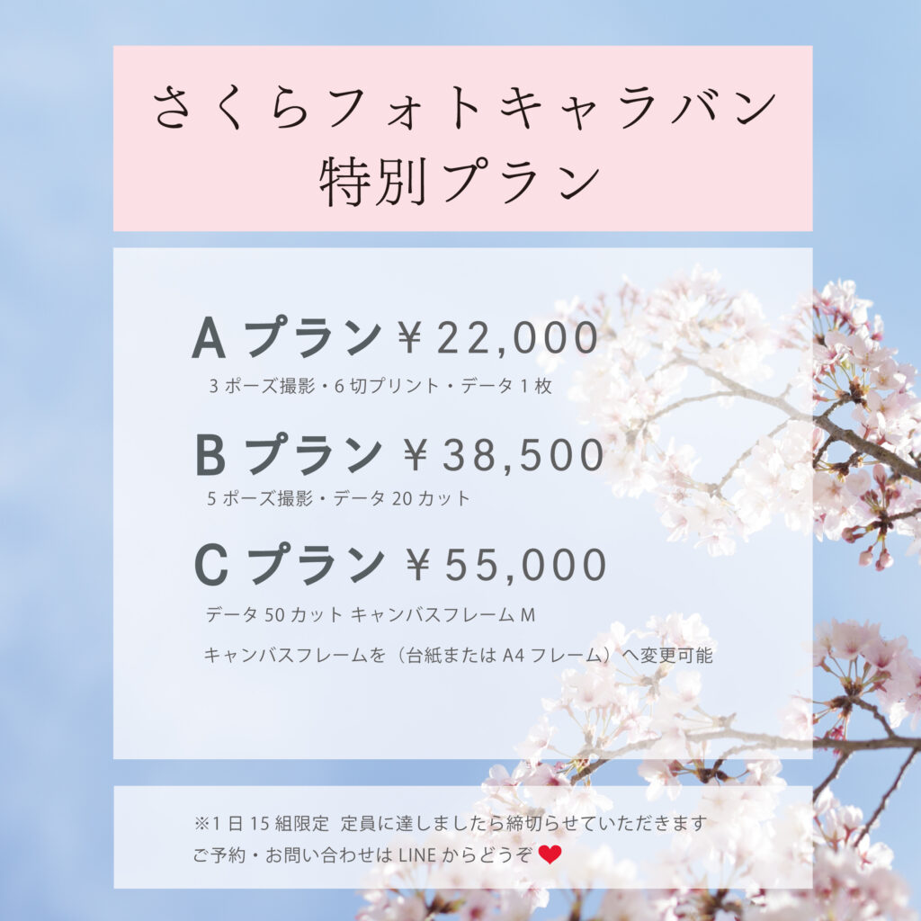 ①ご予約 ➡ さくら撮影会申し込みフォーム、LINEメッセージまたは、お電話にてお名前とご希望の日時・プランをご予約ください