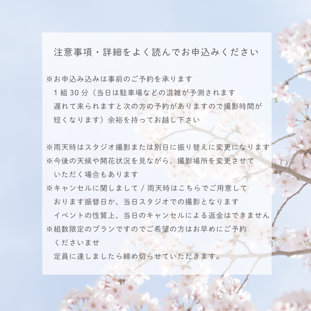 ③撮影前日 ➡天候を確認し、撮影時間を確認します 雨天の場合は延期またはスタジオ撮影にてご対応させていただきます。天候やさくらの状況が心配な方も予備日を1日追加でおさえることも可能です